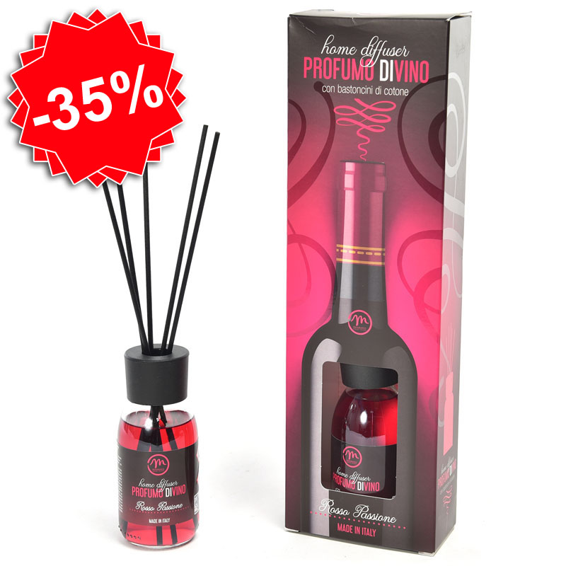 Difuzor sa mirisom "Rosso Passione". Pakovanje sadrži miris u flašici od 125ml i štapiće od bambusa. Set je upakovan u ukrasnu poklon kutiju sa otvorom na prednjoj starni kako bi se videla vrsta mirisa.