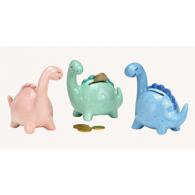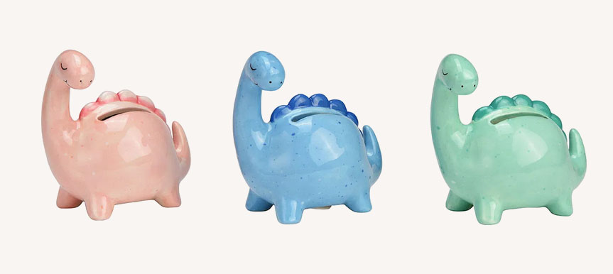 Kasica u obliku malog dinosaurusa raznežiće vas potpuno. Poput beba brontosaurusa, dolazi u tri pastelne boje – roze, plavoj i zelenoj. Mogu biti savršen poklon uz prve parice za novorođenče, mali znak pažnje za dečaka koji voli dinosauruse, ili dekorativan detalj u dečjoj sobi. Dimenzije 10x9cm.