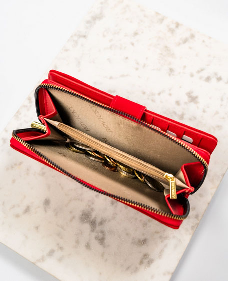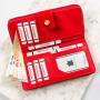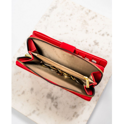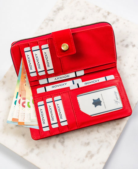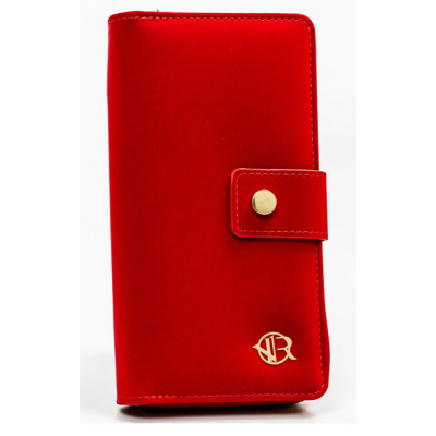 Elegantni novčanik crvene boje od kvalitetne eko kože sa praktičnom kopčom. Unutra se nalazi 8 mesta za kartice, deo za papirne novčanice i pregrada za sitan novac sa dodatnim rajfešlusom. Dimenzija 11x15 cm. Pakovan u dekorativnu poklon kutiju, ovaj novčanik srednje veličine spaja praktičnost i moderan izgled – savršen poklon za svaku priliku.