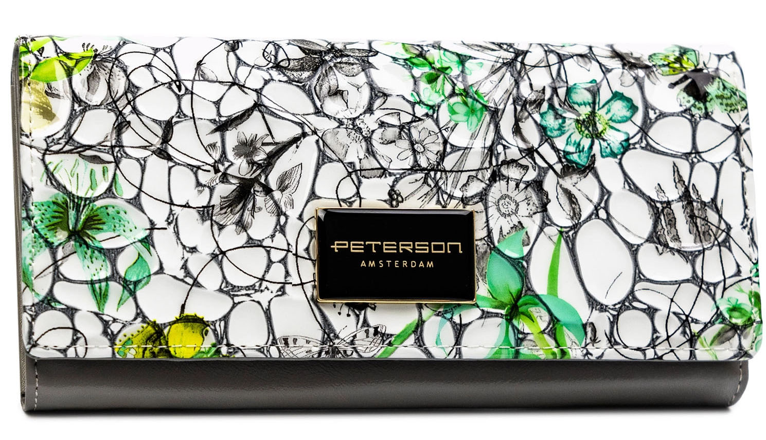 Ženski novčanik od lakirane kože modernog i prepoznatljivog dizajna. Na elegantnoj crnoj osnovi ističe se gornji deo u belim i zelenim tonovima oblutaka i cvetića koji mu daju svežinu i jedinstven karakter. Poseban detalj je metalna pločica sa natpisom "Peterson Amsterdam", deo čije kolekcije je i ovaj model. Dimenzija 18,5 x 9,5 cm. Pakovan u originalnu kutiju, ovaj novčanik je idealan poklon za svaku elegantnu damu.