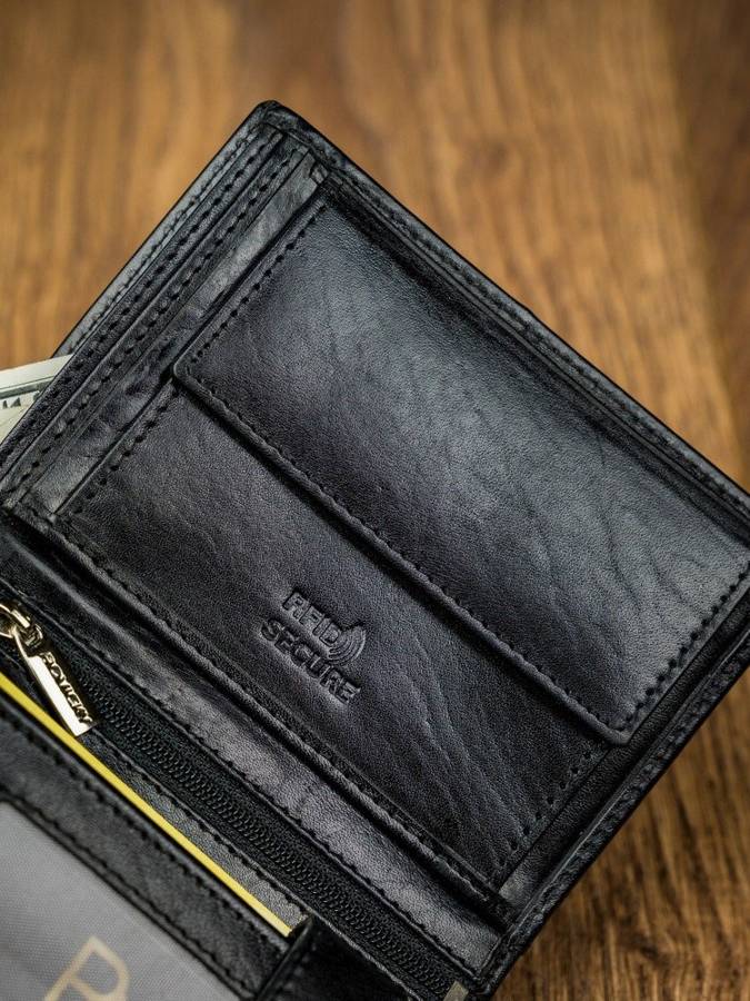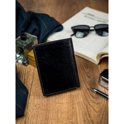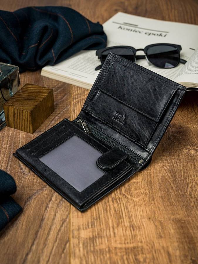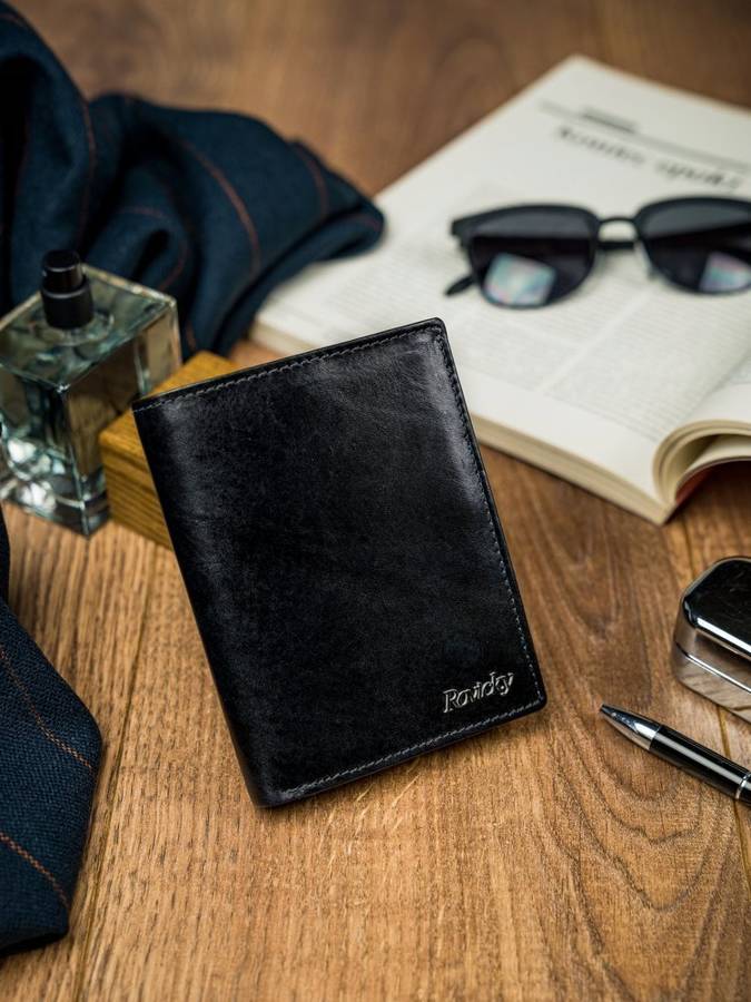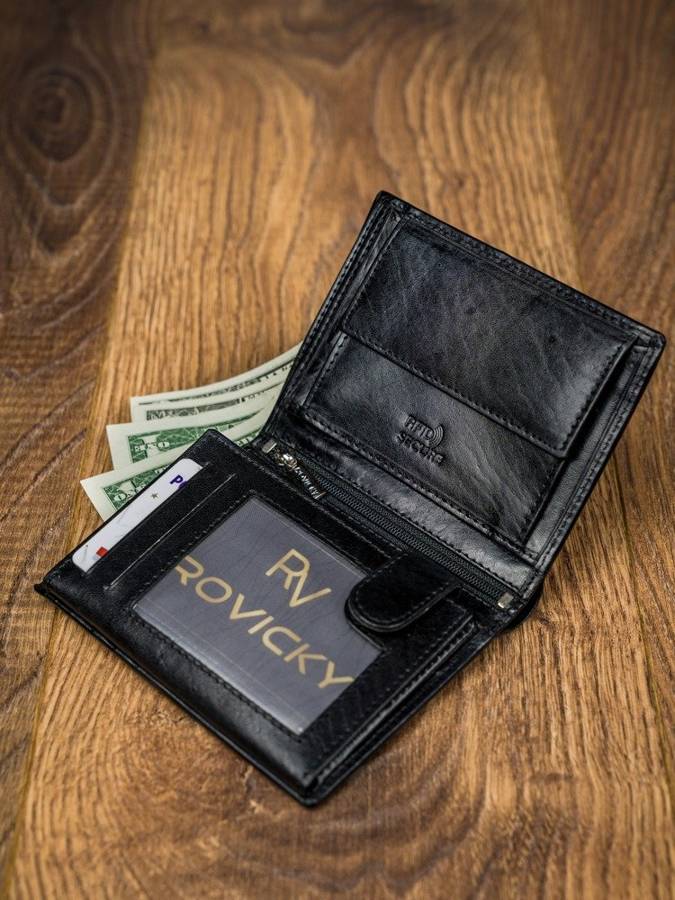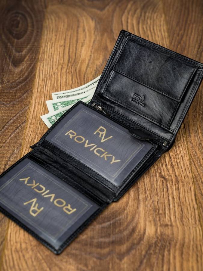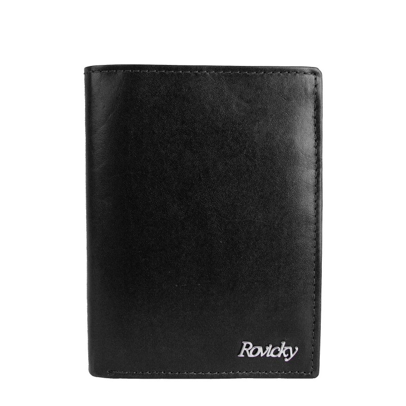 Kožni muški novčanik , uspravan, vrlo elegantan. Crne boje sa natpisom "Rovicky". Novčanik ima dosta mesta za kartice , dokumenta, džep za sitni novac , mesta za papirni novac .I jedan odeljak osiguran rajfešlusom kao tajni pregradak. Dimenzije 9x13x2,5cm.
