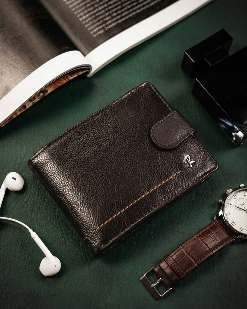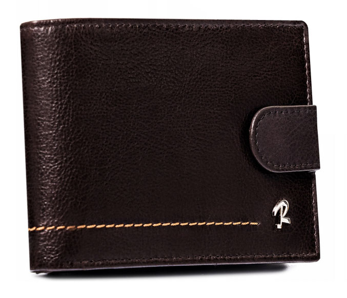 Kožni muški novčanik , vrlo elegantan. Braon boje sa ukrasnim štepom i metalnim slovom R na prednjoj strani. Novčanik ima dosta mesta za kartice , dokumenta, džep za sitni novac , mesta za papirni novac .I jedan odeljak osiguran rajfešlusom kao tajni pregradak. Dimenzije 13x9x3cm.