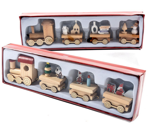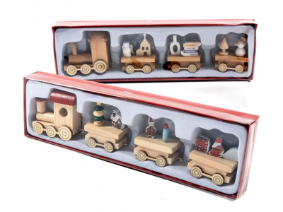 Novogodišnji drveni vozić, sa lokomotivom i tri vagona u prirodnim natur bojama, nosi poklone i radost u svaki dom. Izrađen od kvalitetnog drveta, dužine 27 cm. Interesantan poklončić za mališane. Upakovan u poklon kutiju.