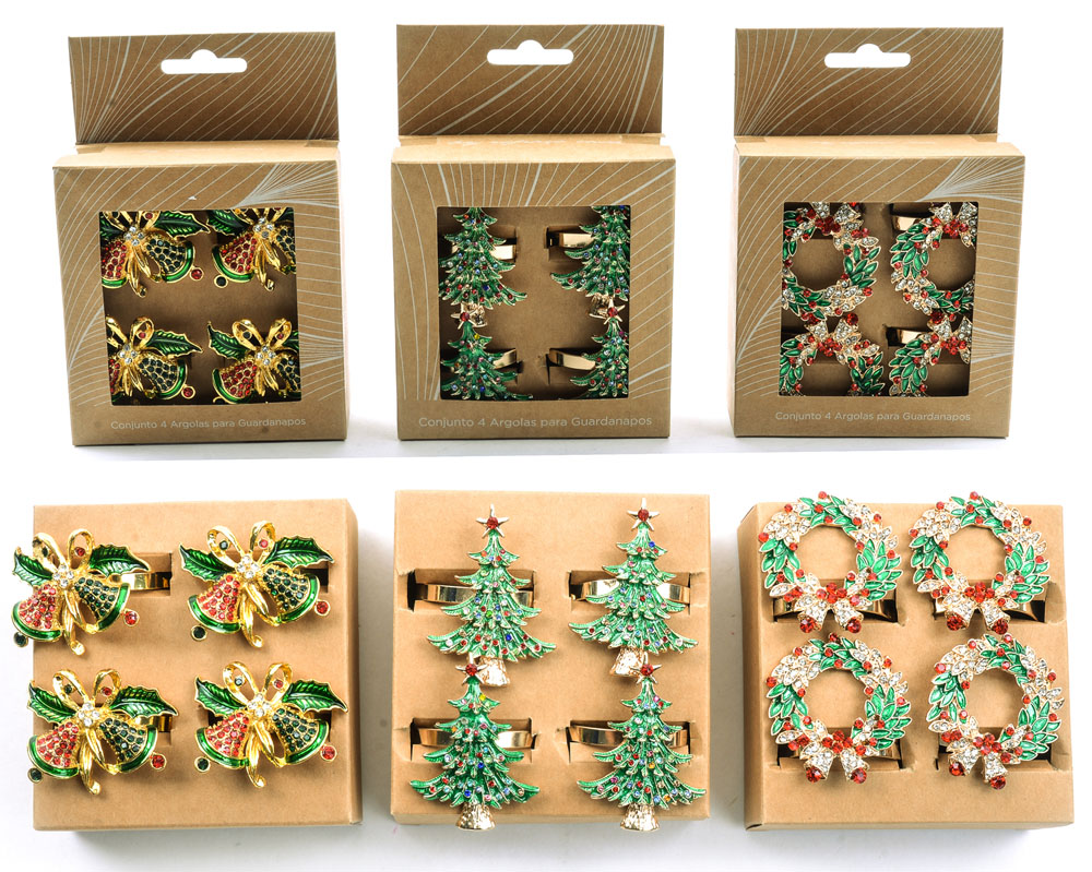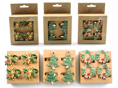 Set od 4 prstena sa za salvete sa cirkonima, kao doza prazničnog sjaja svečanoj trpezi. Dostupni u 4 motiva – zvona, jelkice i božićni venac. Italijanski dizajn, pakovani su u dekorativnu natron poklon kutiju. Originalan novogodišnji, koleginici, rodjaki ili drugarici koja započinje samostalan život.