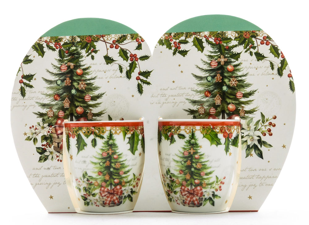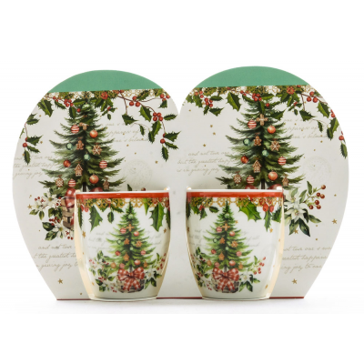 Set od dve male keramičke šolje interesantno pakovane. Krasi ih romantična slika ukrašene jelke i imela po borduri. Neodoljivo romantične, idealne za prazničnu sezonu i sve ljubitelje esspreso kafice.