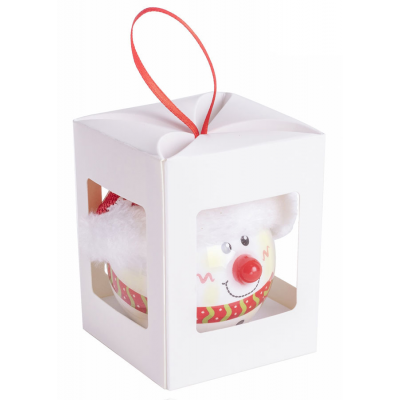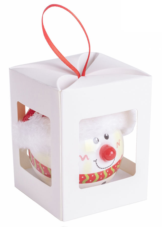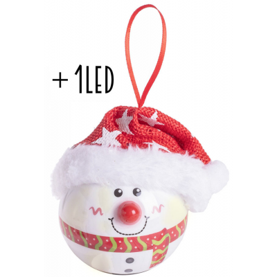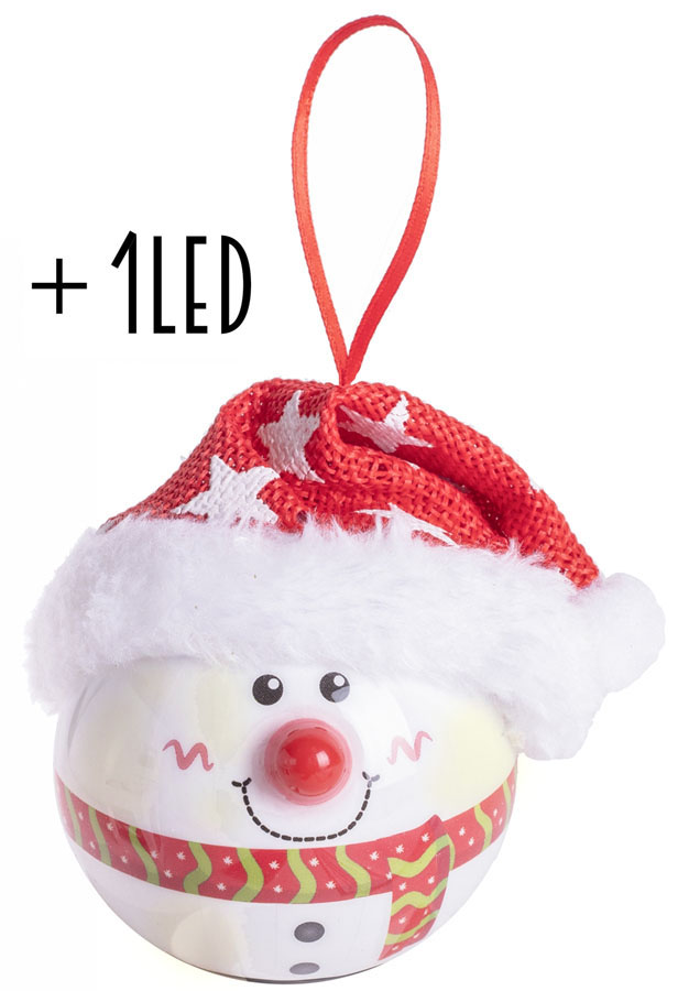 Svetleća novogodišnja kugla sa likom sneška, sa ispupčenim nosem koji svetli, i platnenom kapicom. Izuzetno lagana, sa satenskom tračicom za kačenje, upakovana u kutijicu, idealna za poklon. U sebi sadrzi led lampicu. Prečnik kugle je 7,5cm. Blago je požutela, stoga je na sniženju.