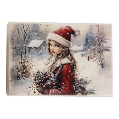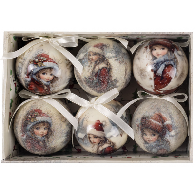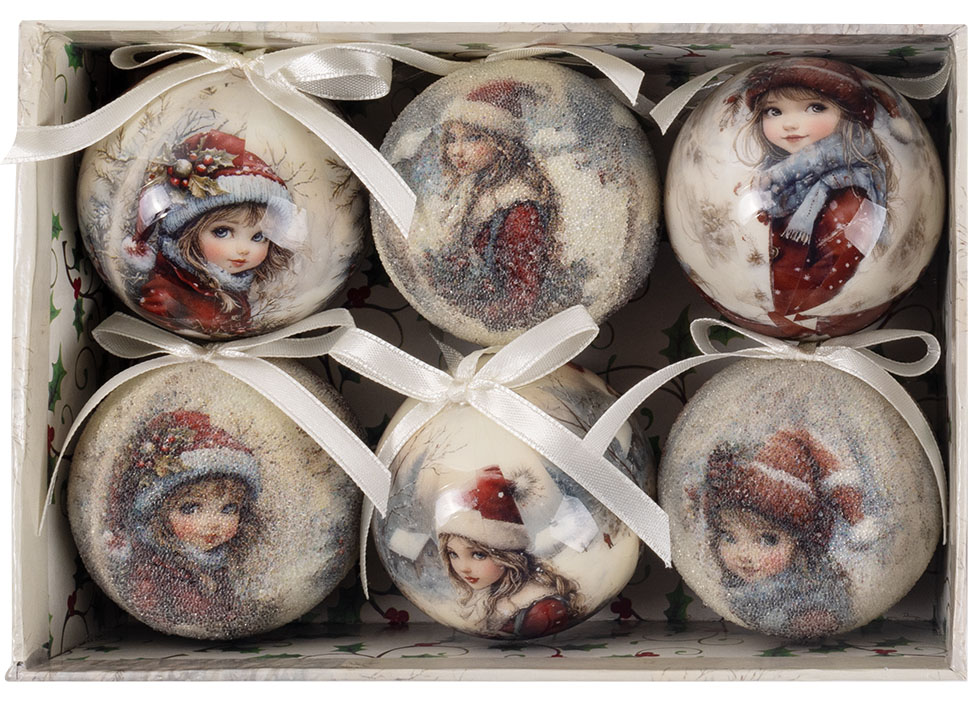 Set od 6 ukrasnih kugli u dekorativnoj kutiji donosi duh starih novogodišnjih čestitki u vaš dom. Svaka kugla prikazuje vintage sliku devojčice na snegu, unoseći toplinu i nostalgiju praznika. Lagane i izrađene od papira, kugle prečnika 60 mm podjednako lepo izgledaju na jelci ili kao šarmantan poklon ispod nje.