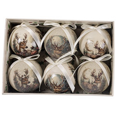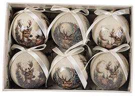 Set od 6 ukrasnih kugli u dekorativnoj kutiji donosi duh starih novogodišnjih čestitki u vaš dom. Svaka kugla prikazuje vintage sliku jelena, unoseći toplinu i nostalgiju praznika. Lagane i izrađene od papira, kugle prečnika 60 mm podjednako lepo izgledaju na jelci ili kao šarmantan poklon ispod nje.