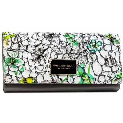 Ženski novčanik od lakirane kože modernog i prepoznatljivog dizajna. Na elegantnoj crnoj osnovi ističe se gornji deo u belim i zelenim tonovima oblutaka i cvetića koji mu daju svežinu i jedinstven karakter. Poseban detalj je metalna pločica sa natpisom "Peterson Amsterdam", deo čije kolekcije je i ovaj model. Dimenzija 18,5 x 9,5 cm. Pakovan u originalnu kutiju, ovaj novčanik je idealan poklon za svaku elegantnu damu.