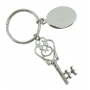 Metalni privezak za ključeve u obliku starinskog ornamentnog ključa i pločica pogodna za graviranje. Pakovan u crnu plišanu kutijicu.