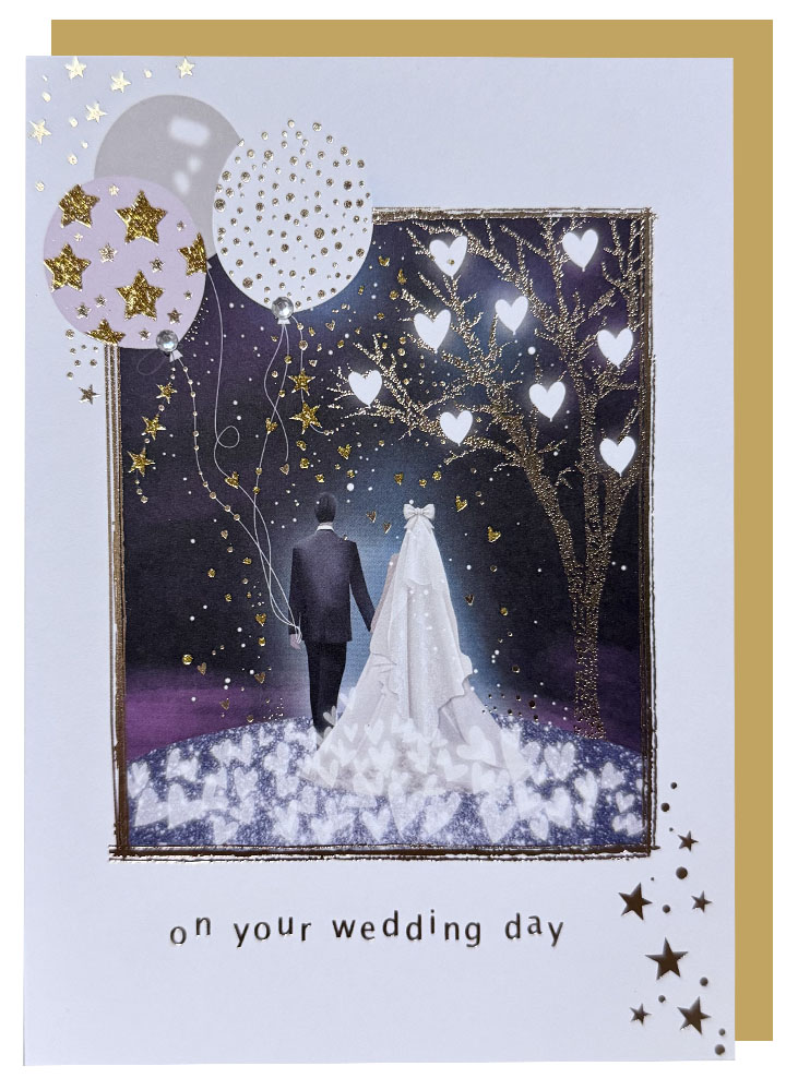 Čestitka sa ilustracijom zaljubljenog para kraj drveta ljubavi i balonima u obliku srca i detaljima sa zvezdicama je idealna za venčanje koje se pamti. Na prednjoj strani piše “On Your Wedding Day” – jednostavno, nežno i efektno. Pravi detalj uz svadbeni poklon ili kao pažljiv gest prijateljima koji započinju zajednički život. Uz čestitku ide pripadajuća koverta . Dimenzije jedne strane čestitke 12,5x18cm , koverta 13,5x19cm.