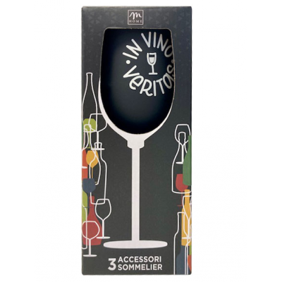 Set za vino upakovan u čašu. Set se sastoji iz 3 dela: vadičep , drop stop čep, i umetak za sipanje vina. Unutrašnjost čaše je obložena plišom. Set je upakovan u dekorativnu poklon kutiju sa otvorom da se vidi izgled čaše. Dimenzije: visina 23cm, prečnik čaše 10cm.