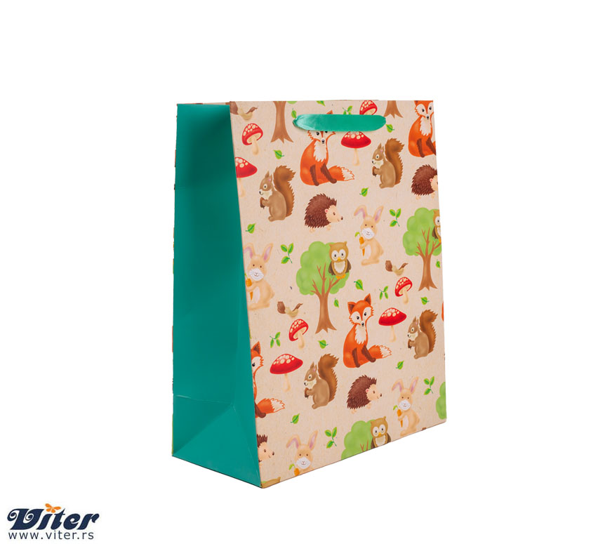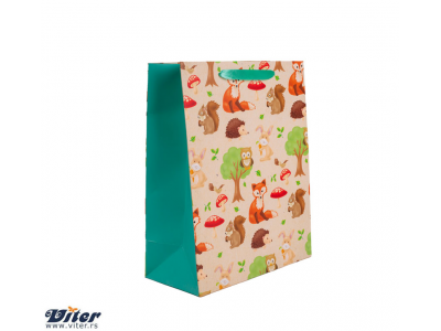 Ukrasna papirna kesa sa motivima šumskih životinjica – ježića, lisice, veverice i zeke – dodaje toplinu i bajkovitost svakom poklonu. Nežan dizajn dopunjen je bočnim ivicama u svežoj zelenoj boji. Dimenzija 18x23x10cm. Savršena za decu i odrasle koji vole prirodu i šarm jednostavnih sitnica.