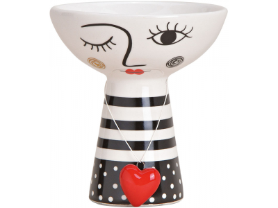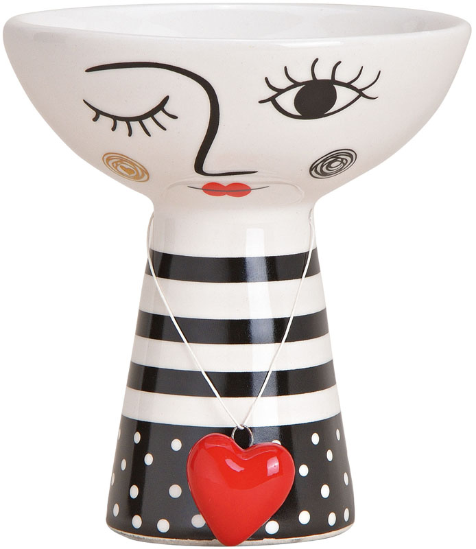 Keramička činijica za sitan nakit, bombone ili grickalice. Moderan crno beli dizajn plus specijalni šarm donosi mala ogrlica sa crvenim srcem. Predstavlja pažljivo odabrani poklon za voljenu osobu ili dragu prijateljicu.Dimenzije 12x11cm.