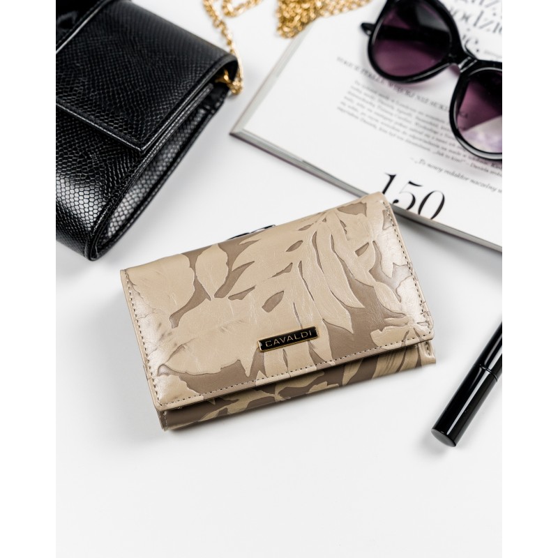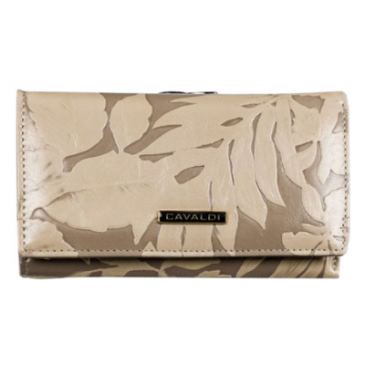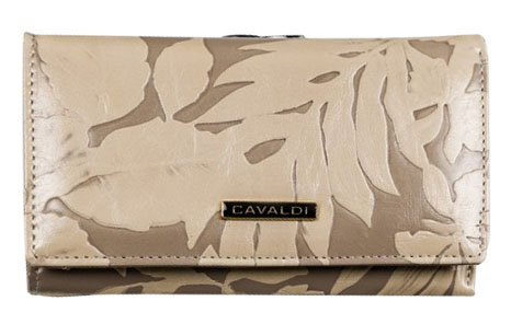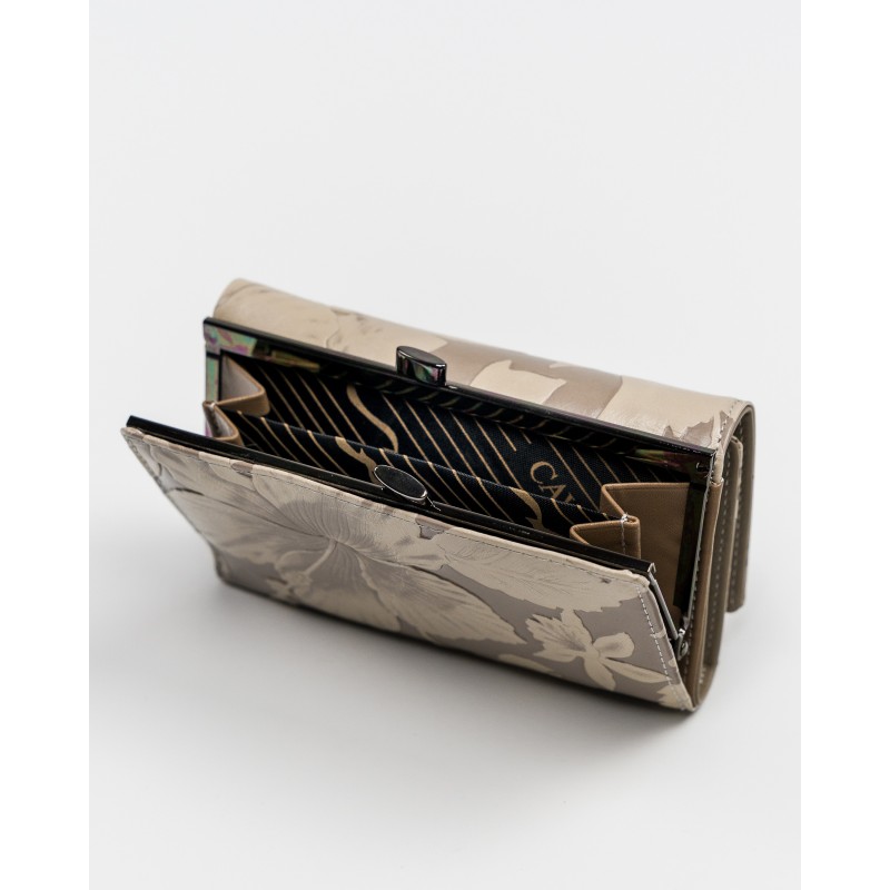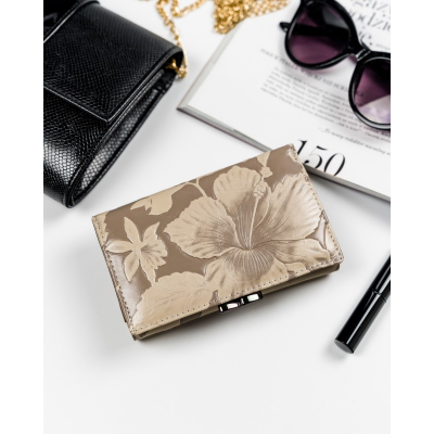Kožni novčanik sa cvetnim printom, veličine 15x10cm. Krem cvetovi na podlozi boje bele kafe. Pakovan u poklon kutiju. Veliki broj pregrada, za sitno, za papirne novčanice, za kartice i za fotografije.