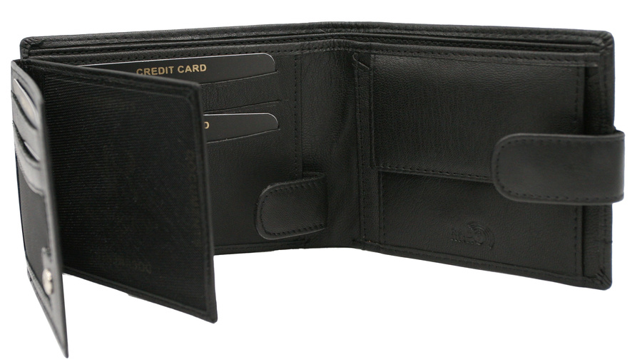 Kožni muški novčanik sa ukrasnim štepom i kopčom. Novčanik ima RFID zaštitu. Ima dosta mesta za kartice, džep za sitni novac, mesta za papirni novac. Pakovan u ukrasnu kutiju. Dimenzije novčanika: 12x9x2cm.