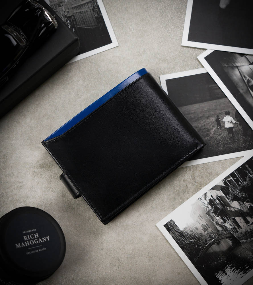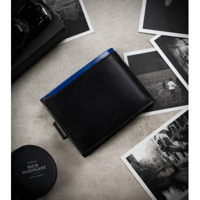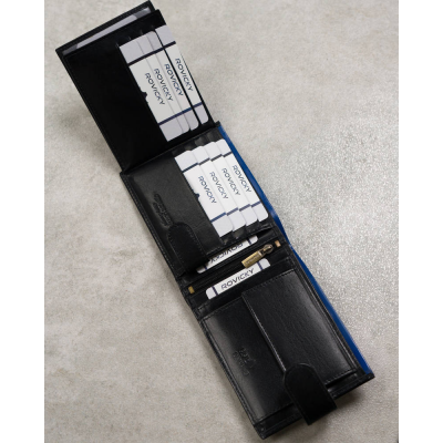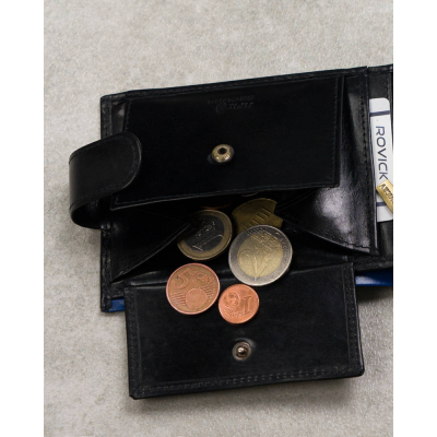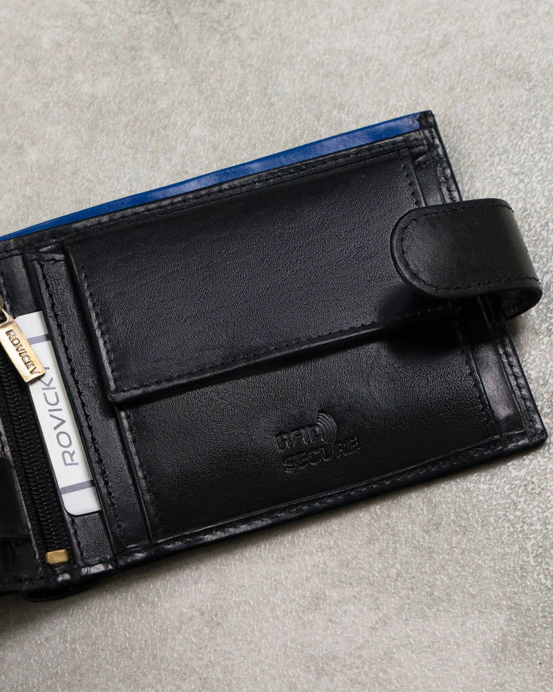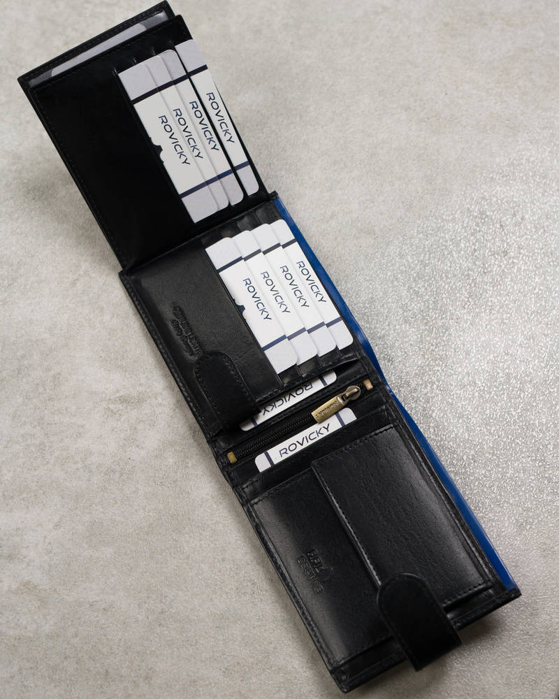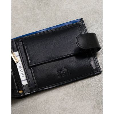 Novčanik kožni, crne boje sa plavim detaljem i bedžom na kome je utisnuto ROVICKY. Novčanik je sa RFID SECURE zaštitom. Sa dosta odeljaka za platne kartice , novac, uz dovoljno mesta da ubacite i druge bitne stvari i da i dalje bude jednako elegantan i moderan. Dimenzije 13X9x3cm.