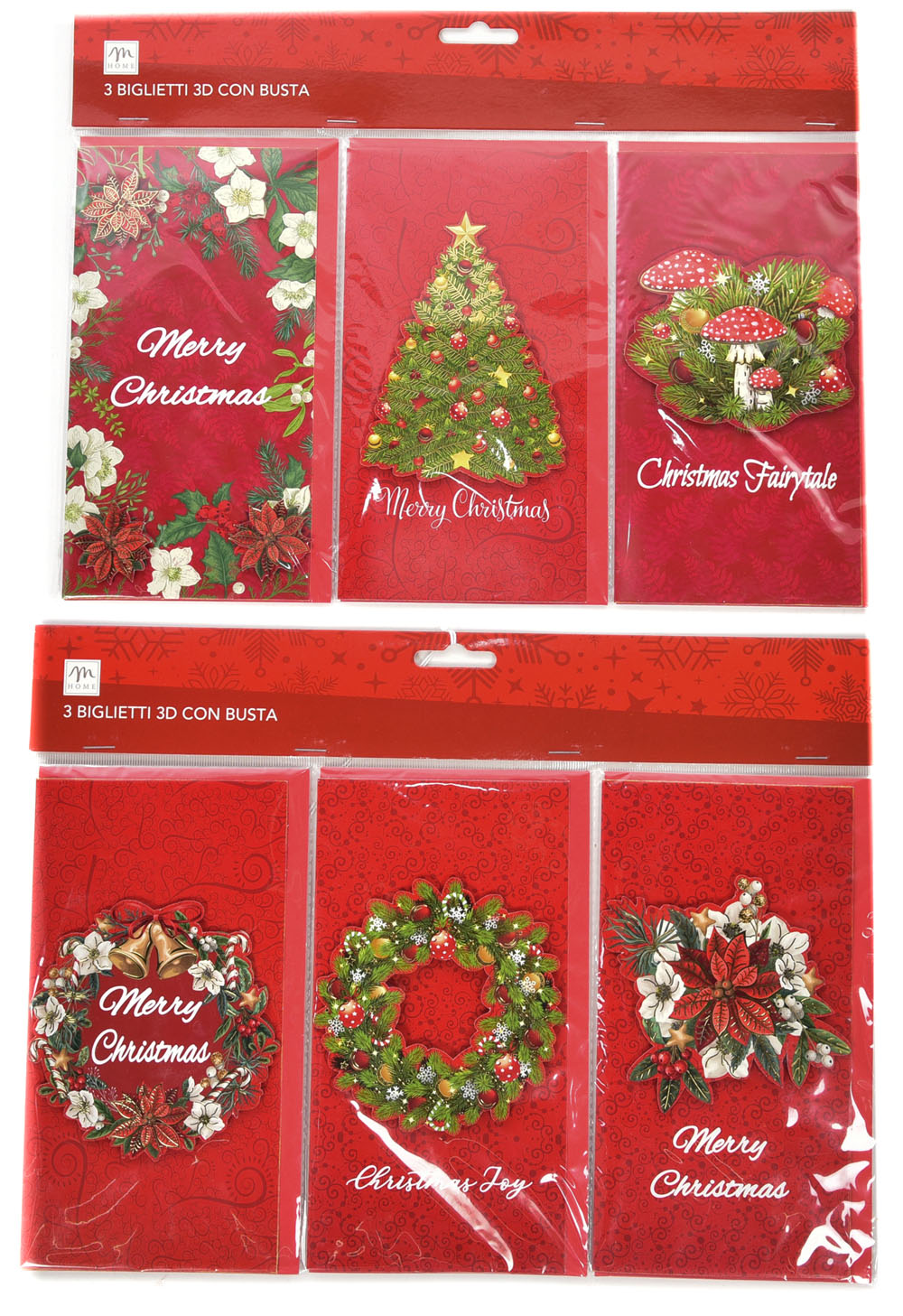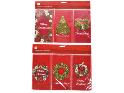 Set od tri novogodišnje čestitke sa crvenim kovertom. Tradicionalni novogodišnji dezeni, sa natpisom Merry Chirstmas.