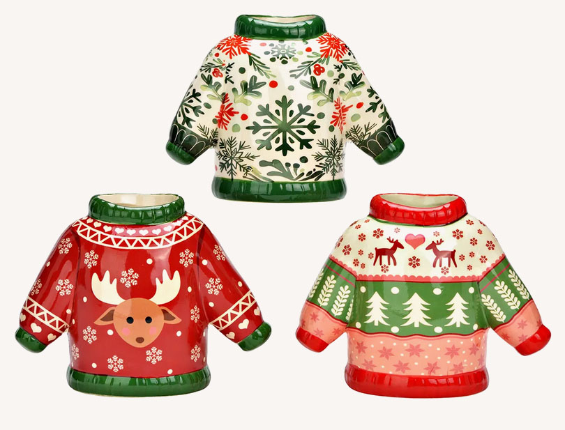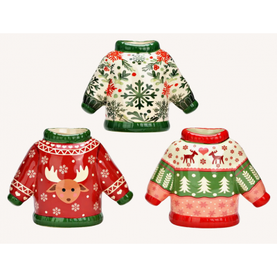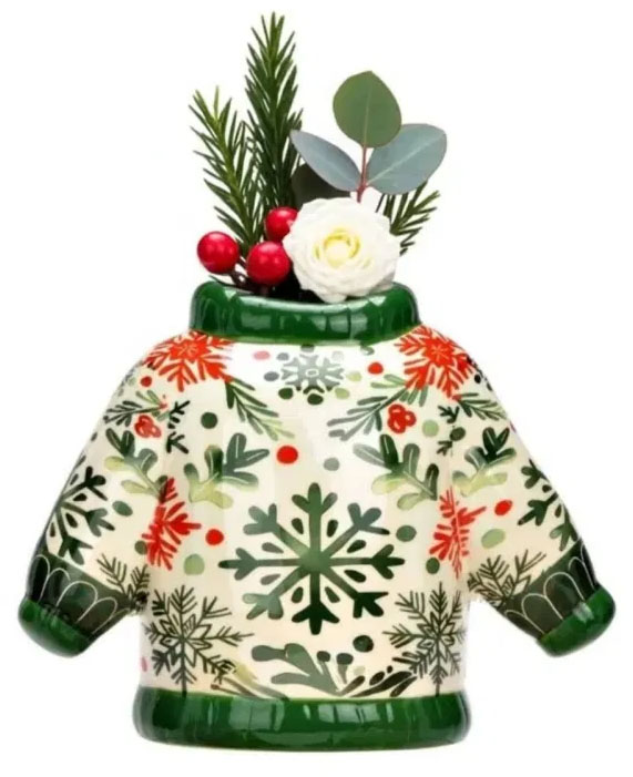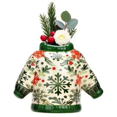 Keramička vaza u obliku zimskog štrikanog džempera unosi toplinu i šarm praznične sezone u svaki dom. Savršena je za borove grančice, suvo cveće ili drugi dekorativni aranžman. Dostupna u tri različita dezena, veličina 15cm.
