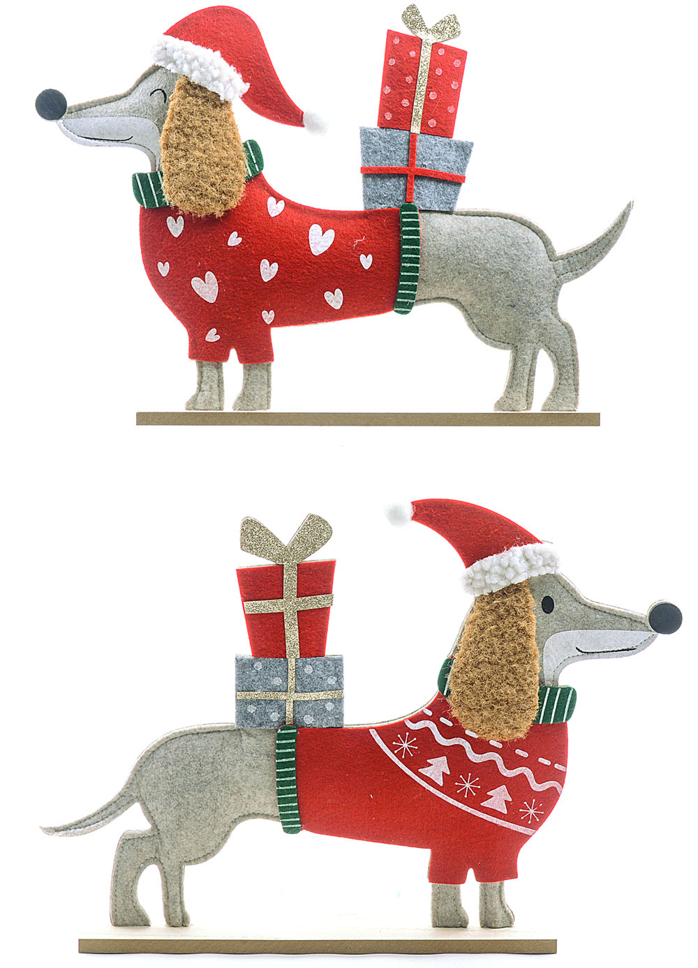 Preslatke figure kuce u filcanom odelcetu, sa poklonima na leđima, dužine 40cm, dostupne dva motiva. Idealne su za ukrašavanje prozora, police, dečije sobe ili omiljenog kutka u domu. Šarmantna ideja za poklon ljubiteljima jazavičara i ostalih vernih kućnih ljubimaca.