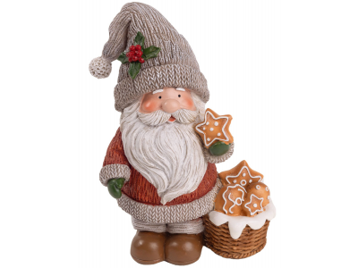 Slatka figura Deda Mraza sa neobičnom štrikanom kapicom i punom korpom medenjaka unosi priziva miris praznika u vaš dom. Veselih boja i pažljivo izrađenih detalja, ovaj Deda Mraz deluje kao da je upravo stigao iz božićne pekare.Dimenzije figure su 17x10cm, izrađena je od kvalitetnog polirezina.