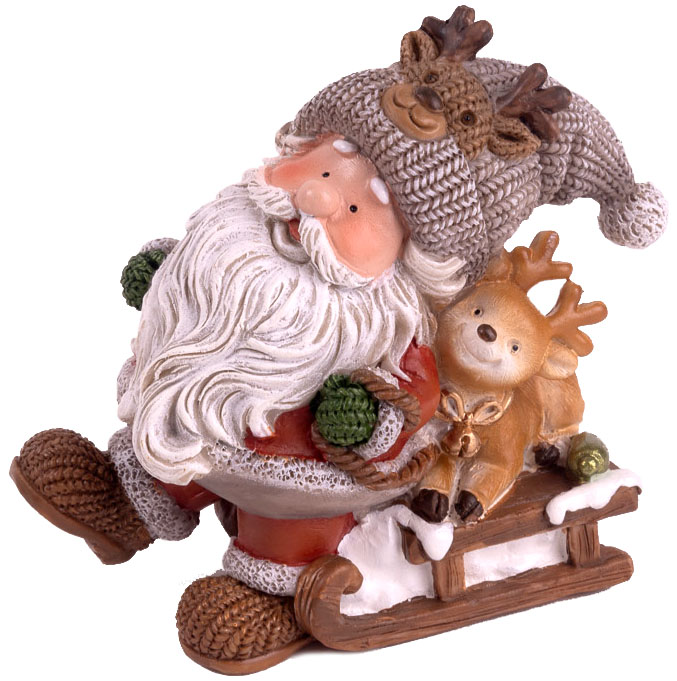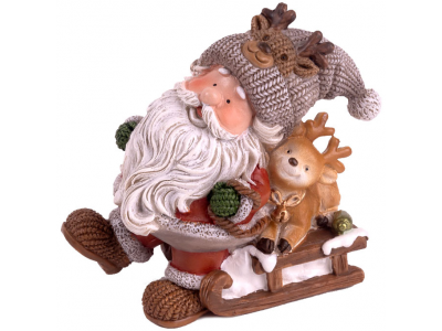 Figura razdraganog Deda Mraza koji se sanka sa svojim prijateljem – malim beba irvasom – donosi pravu prazničnu radost u svaki kutak doma. Napravljena od polirezina, 8 cm, lako uklopljiv detalj za policu, sto ili prozor koji traži malo praznične čarolije.