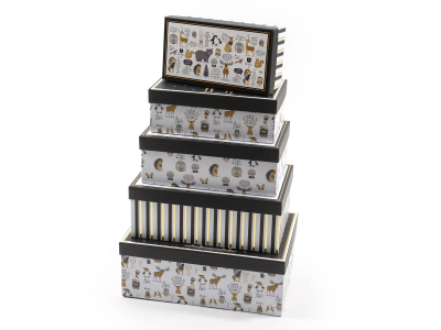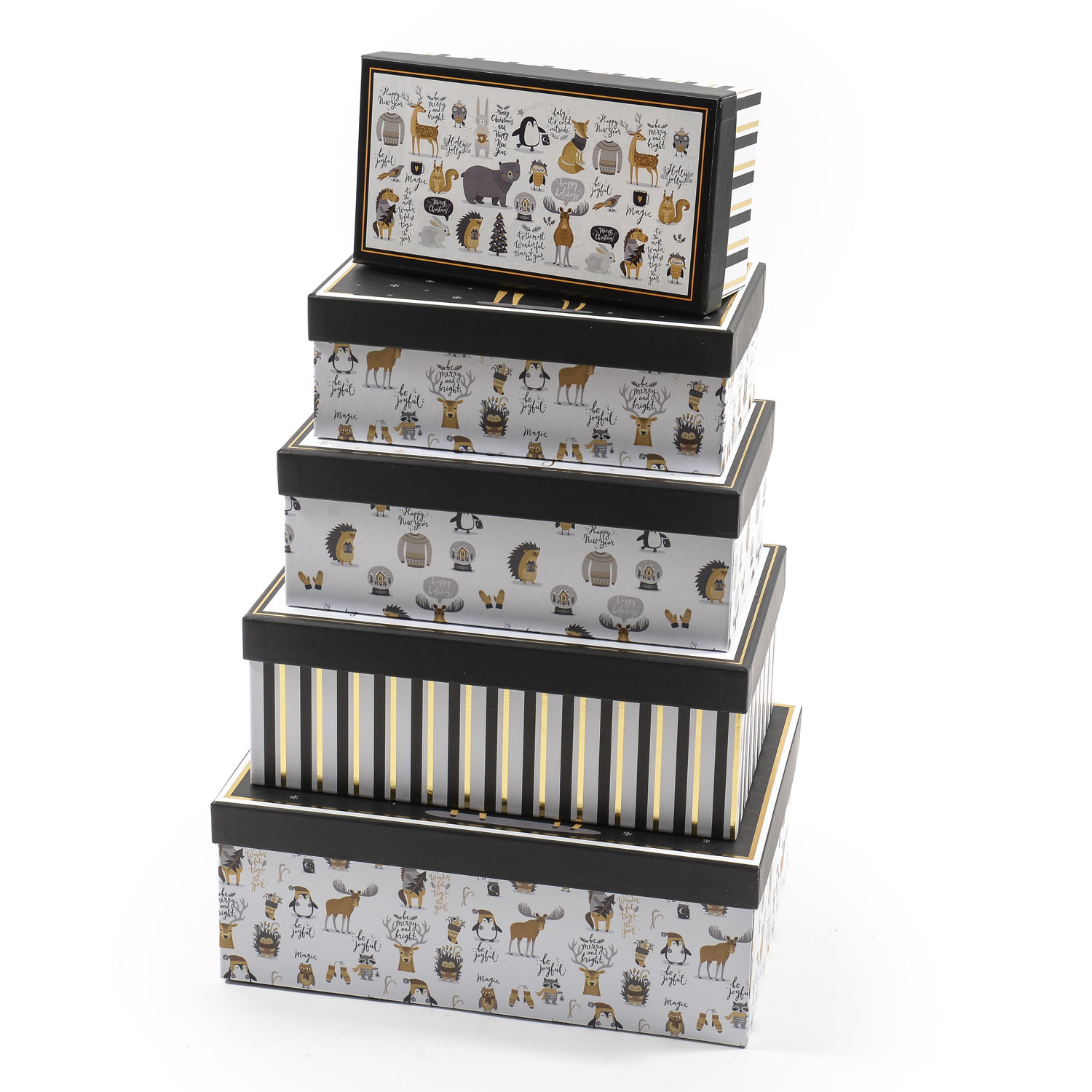 Novogodišnja ukrasna kutija sa belom podlogom na poklopcu i šumskim životinjama .Veličina : 24.5x16cm i visina 9.5cm