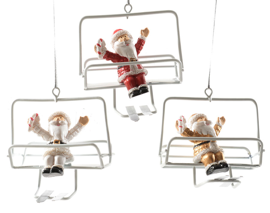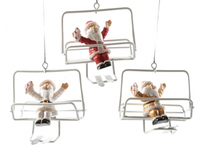 Novogodišnji ukras figura Deda Mraza na žičari sa skijama. Ukras je sa Deda Mrazom u beloj ili crvenoj ili zlatnoj boji. Materijal: figura je od rezina a korpa žičare je od metala. Dimenzije: 7x5xH8cm. Cena je za komad.