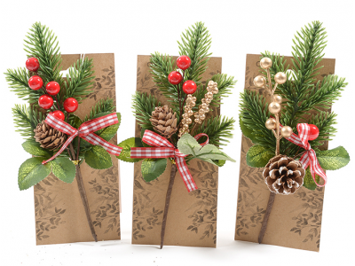 Dekorativna grančica od imitacije jelovih grana sa kariranom masnicom, za dekoraciju poklona, novogodišnje jelke, i stonih aranžmana. Materijal: plastika. Dimenzije: 8x5xH.20cm