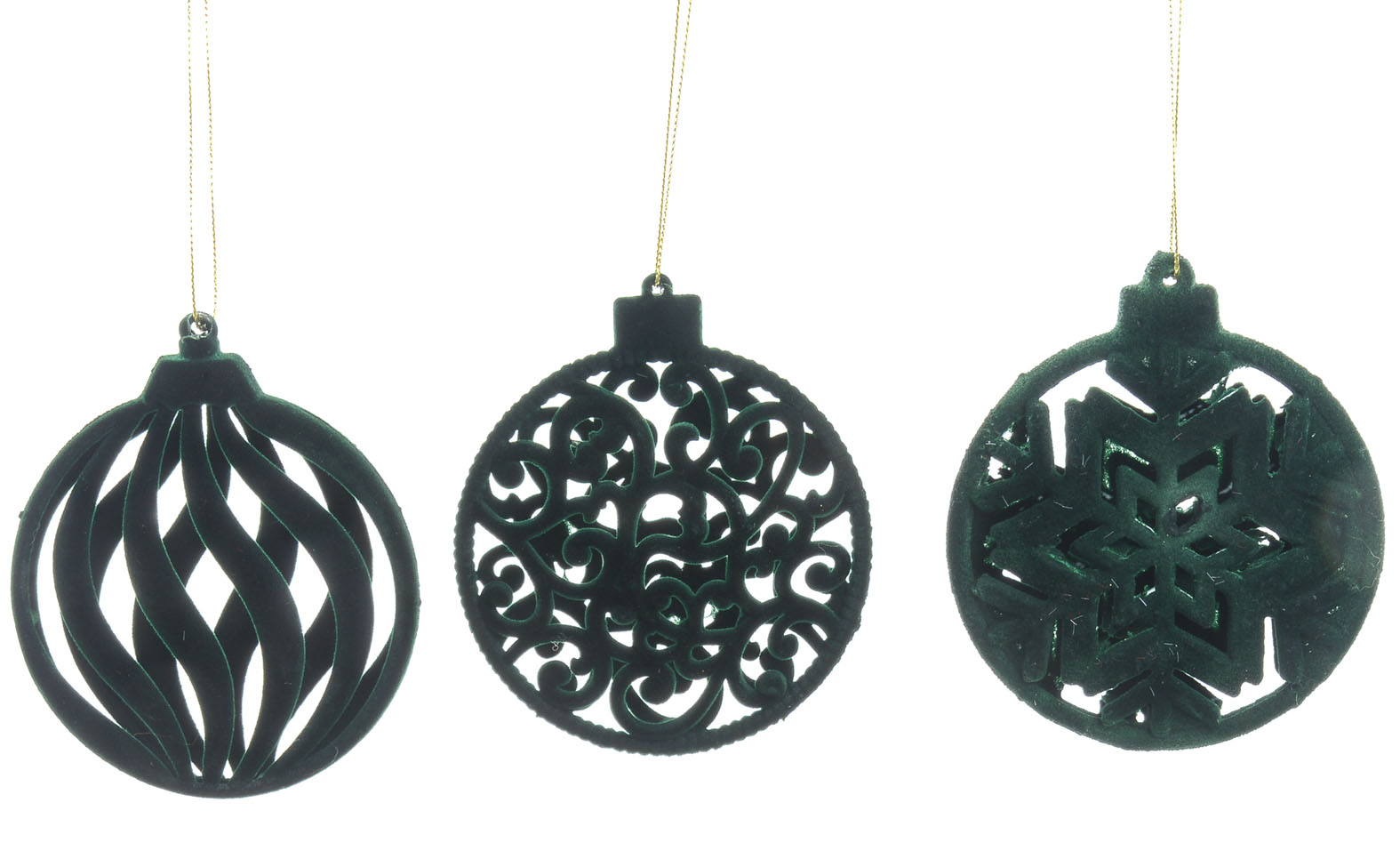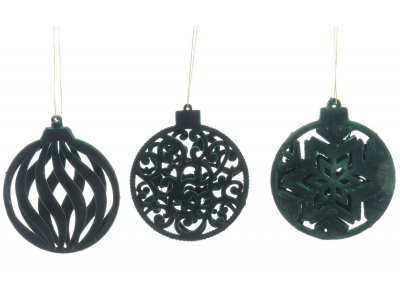Plišani zeleni ukrasi za jelku i praznične aranžmane, dimenzija 8 cm, donose dašak raskoši i prefinjenosti u svaki kutak doma.Elegantni i nenametljivi, tri motiva kugli. Lepi pojedinačno a i odlično se kombinuju sa drugim ukrasima.