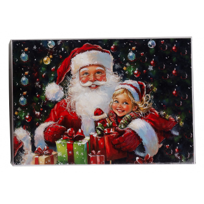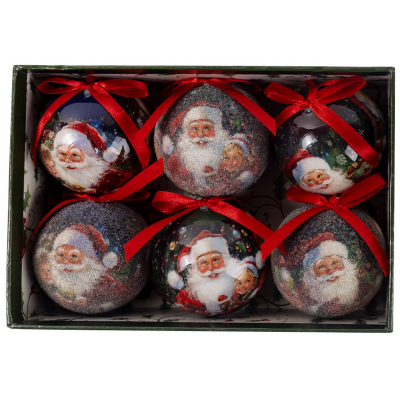 Set od 6 ukrasnih kugli u dekorativnoj kutiji donosi duh starih novogodišnjih čestitki u vaš dom. Svaka kugla prikazuje vintage sliku Deda Mraza sa devojčicom, unoseći toplinu i nostalgiju praznika. Lagane i izrađene od papira, kugle prečnika 60 mm podjednako lepo izgledaju na jelci ili kao šarmantan poklon ispod nje.