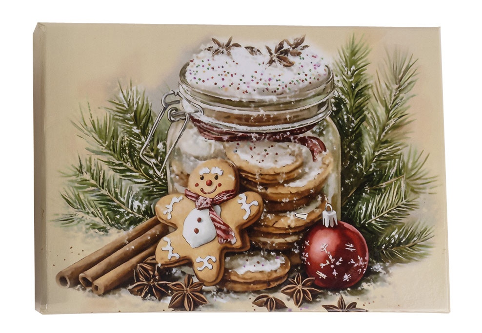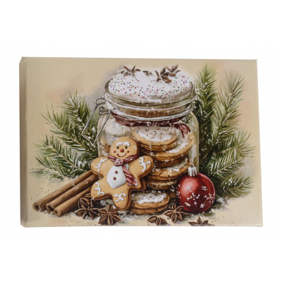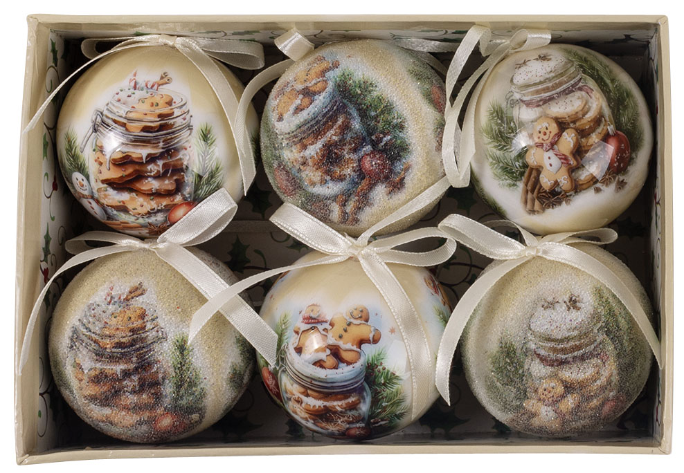 Set od 6 ukrasnih kugli u dekorativnoj kutiji donosi duh starih novogodišnjih čestitki u vaš dom. Svaka kugla prikazuje vintage sliku tegle pune medenjaka, unoseći toplinu i nostalgiju praznika. Lagane i izrađene od papira, kugle prečnika 60 mm podjednako lepo izgledaju na jelci ili kao šarmantan poklon ispod nje.
