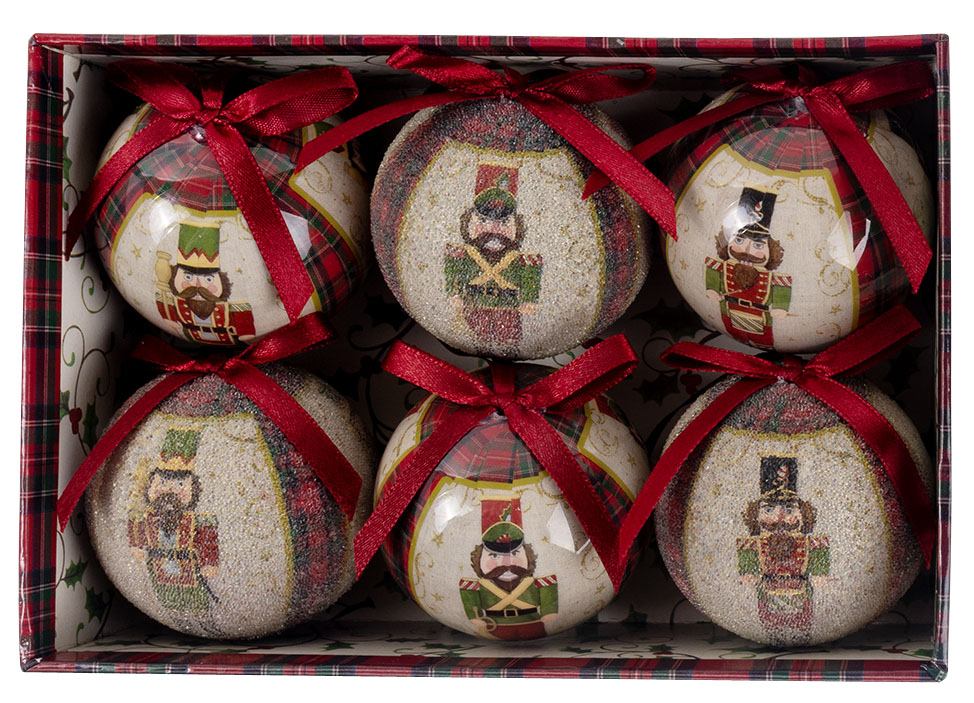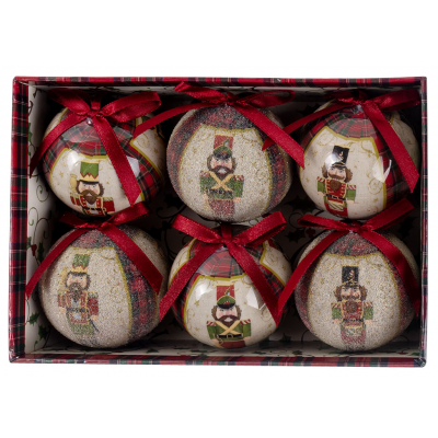 Set od 6 ukrasnih kugli u dekorativnoj kutiji donosi duh starih novogodišnjih čestitki u vaš dom. Svaka kugla prikazuje vintage sliku Krcka Oraščića, unoseći toplinu i nostalgiju praznika. Lagane i izrađene od papira, kugle prečnika 60 mm podjednako lepo izgledaju na jelci ili kao šarmantan poklon ispod nje.