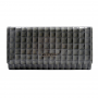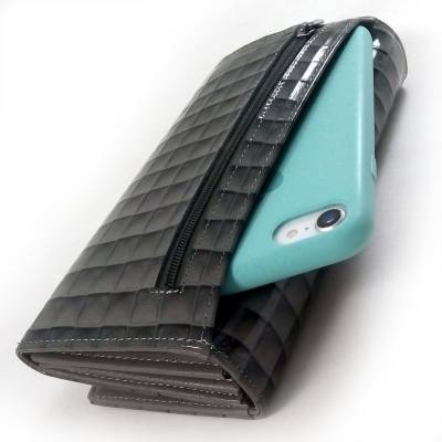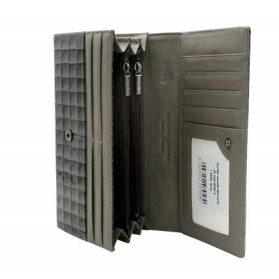 Ženski kožni novčanik ekskluzivnog dizajna, sive boje sa printom kvadratića u dve nijanse sive. Pakovan u belu poklon kutiju. Dimenzije novčanika su 18x10cm. Ima dva dela sa rajfenšlusom za sitniš i važne stvari. Tri velike pregrade, deo za kartice i za fotografije. Sa zadnje strane dva džepa, jedan za mobilini telefon, drugi sa rajfenšlusom za vrednosti.