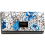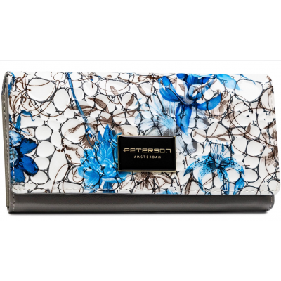 Ženski novčanik od lakirane kože modernog i prepoznatljivog dizajna. Na elegantnoj crnoj osnovi ističe se gornji deo u belim i plavim tonovima oblutaka i cvetića koji mu daju svežinu i jedinstven karakter. Poseban detalj je metalna pločica sa natpisom "Peterson Amsterdam", deo čije kolekcije je i ovaj model. Dimenzija 18,5 x 9,5 cm. Pakovan u originalnu kutiju, ovaj novčanik je idealan poklon za svaku elegantnu damu.