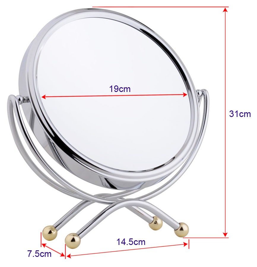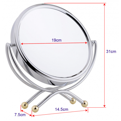 Metalno srebrno ogledalo sa uveličanjem x5, velikim staklom prečnika 19cm. Kombinuje elegantan dizajn i vrhunsku funkcionalnost, sa velikim staklom koje pruža jasnu i preciznu refleksiju. Stabilno postolje je ukrašeno zlatnim kuglicama čini ovo ogledalo modernim komadom koji se savršeno uklapa u svaki prostor. Idealno za šminkanje i svakodnevnu jutarnju i večernju rutinu nege lica i kose. Ogledalo je visine 31cm, pakovano u belu poklon kutiju, bezbedno za slanje.