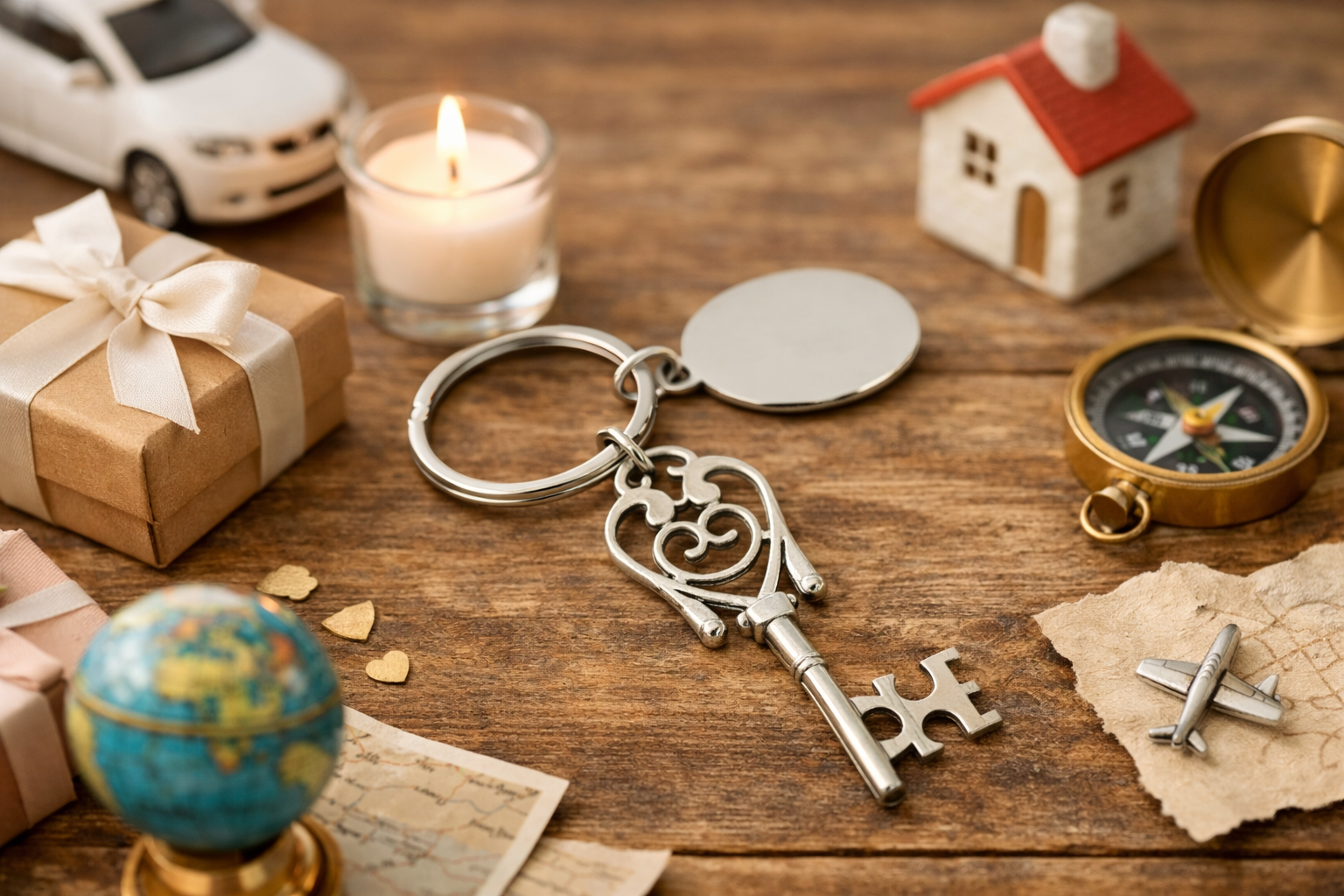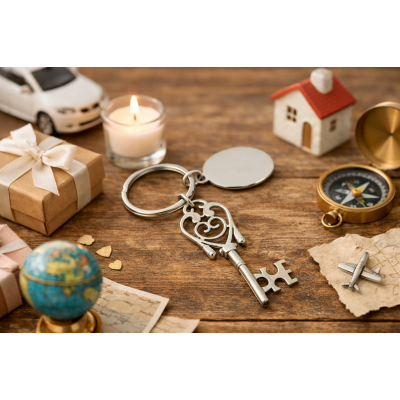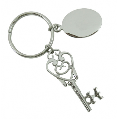 Metalni privezak za ključeve u obliku starinskog ornamentnog ključa i pločica pogodna za graviranje. Pakovan u crnu plišanu kutijicu.