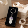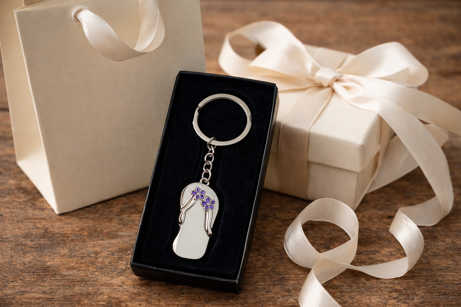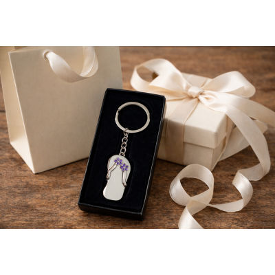 Metalni privezak, u obliku japanke sa dva ljubičasta cvetića. Pakovan u crnu plišanu poklon kutijicu.