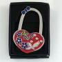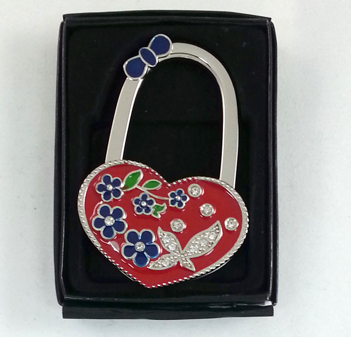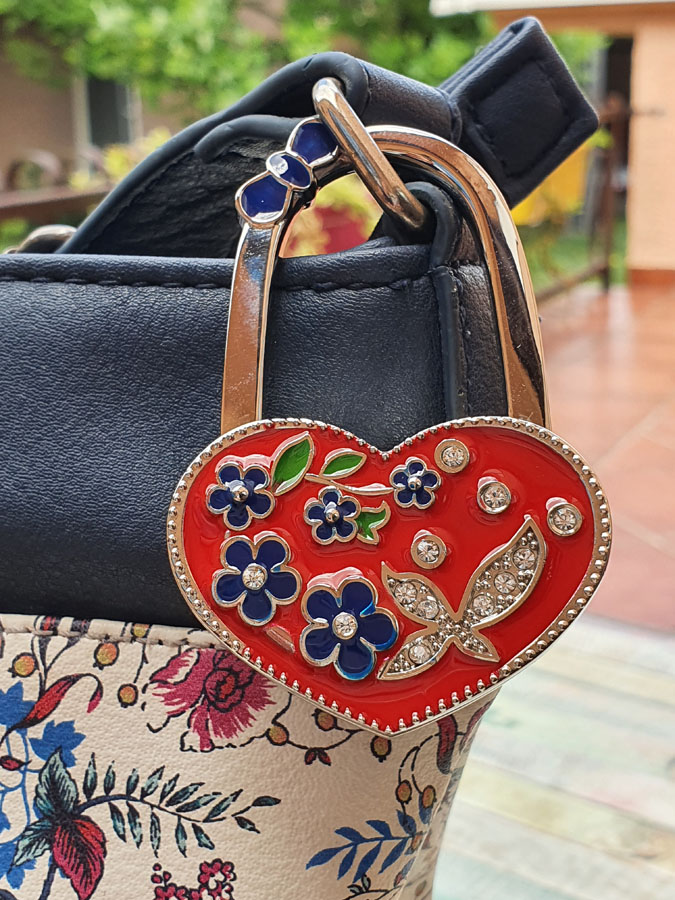 Metalna kuka za tašnu u obliku srca, crvene boje, ukrašena sitnim detaljima cvetića i ptičice. Praktična i elegantna. Savršen je dodatak svakoj torbi – lako drži tašnu na stolu ili u kafiću. Idealan kao mali, pažljiv poklon za Dan zaljubljenih, koji svaka devojka želi u svojoj torbi.