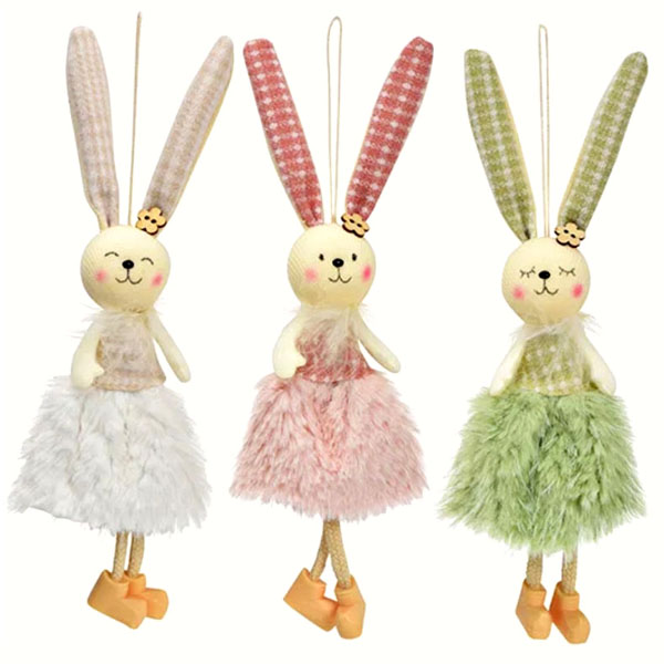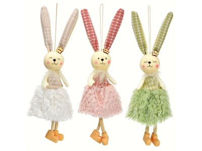 Uskršnji ukras zečice u suknjama sa kariranim ušima. Materijal: tekstil, dimenzije: 8x2xH23cm.