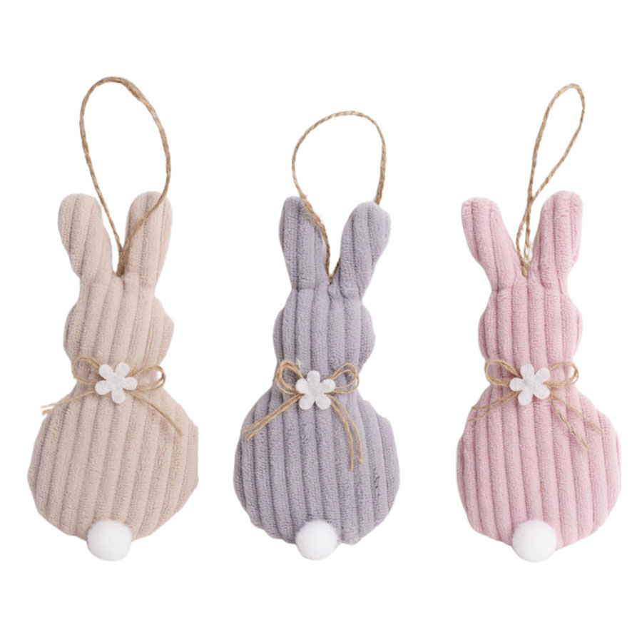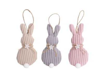 Platneni ukras za kačenje, u obliku siluete zeke. Prijatni na dodir, sa straftama u nežnoj bež, sivoj ili rozoj boji, za kačenje i uskršnje aranžmane. Poseban detalj je mašnica oko vrata sa cvetičem i rep od bele pufne. Dužina 13cm, cena za komad.