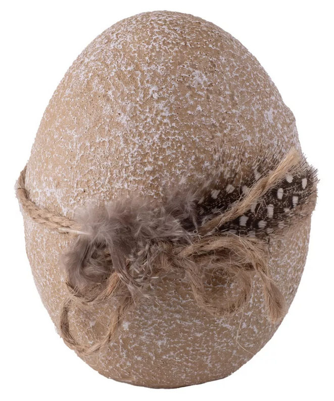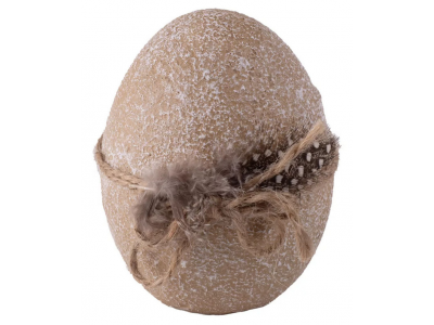 Uskršnje braon melirano jaje, ukrašeno percem pričvršćeno kanapom. Materijal: polirezin. Visina jaja 8,4cm.