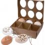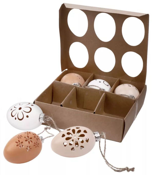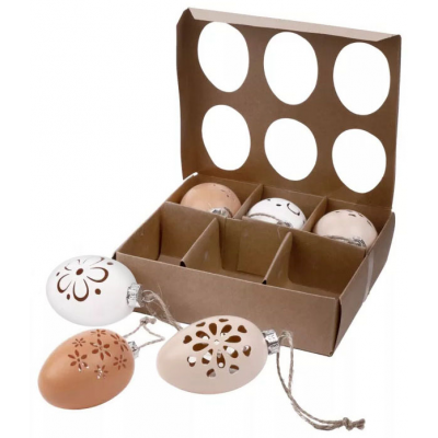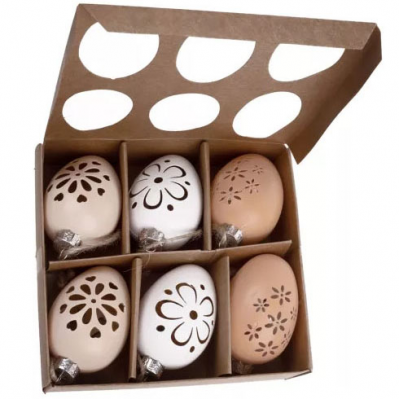 Set od 6 jaja upakovanih u kartonsku kutiju. Jaja su u prirodnim tonovima, sa različitim rezbarenim dezenima. Veličina jednog jaja: 4x6cm. Cena je za jedan set.