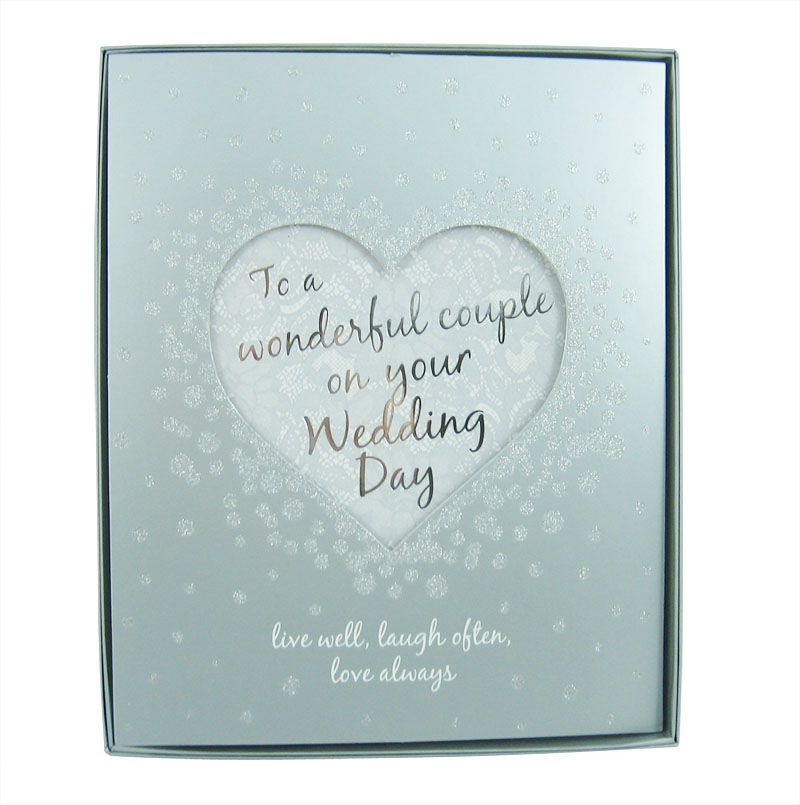 Elegantna čestitka za venčanje, u svojoj kutiji umesto koverte. Čestitka je srebrne boje, na naslovnoj strani ima otvor u obliku srca oko koga je puno posutog štrasa. U unutrašnjosti čestitke je tekst koji se vidi kroz pomenuti otvor u obliku srca.Oko pomenutog teksta i na suprotnoj strani ostaje mesta za ispisivanje ličnih poruka, čestitki i najlepših želja. Dimenzije čestitke : 25x20cm