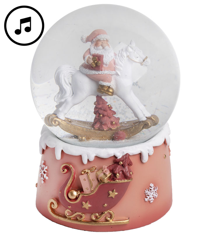 Muzička snežna, vodena kugla sa Deda Mrazom koji se ljulja na drvenom konjiću na čijem postolju je jelkica. Staklena kugla je na postolju na kom su sanke Deda Mraza pune paketića i pahulje. Materijal: polirezin i staklo. Dimenzije: 14cm